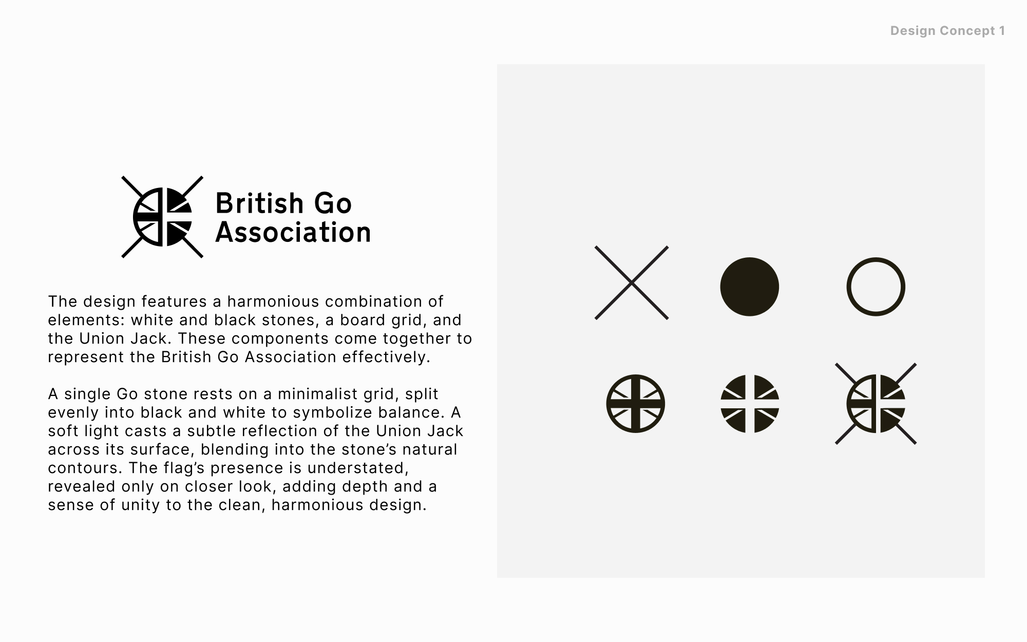 The design features a harmonious combination of elements: white and black stones, a board grid, and the Union Jack. These components come together to represent the British Go Association effectively. A single Go stone rests on a minimalist grid, split evenly into black and white to symbolize balance. A soft light casts a subtle reflection of the Union Jack across its surface, blending into the stone’s natural contours. The flag’s presence is understated, revealed only on closer look, adding depth and a sense of unity to the clean, harmonious design.