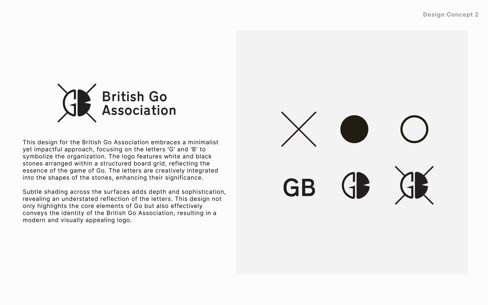 This design for the British Go Association embraces a minimalist yet impactful approach, focusing on the letters 'G' and 'B' to symbolize the organization. The logo features white and black stones arranged within a structured board grid, reflecting the essence of the game of Go. The letters are creatively integrated into the shapes of the stones, enhancing their significance. Subtle shading across the surfaces adds depth and sophistication, revealing an understated reflection of the letters. This design not only highlights the core elements of Go but also effectively conveys the identity of the British Go Association, resulting in a modern and visually appealing logo.
